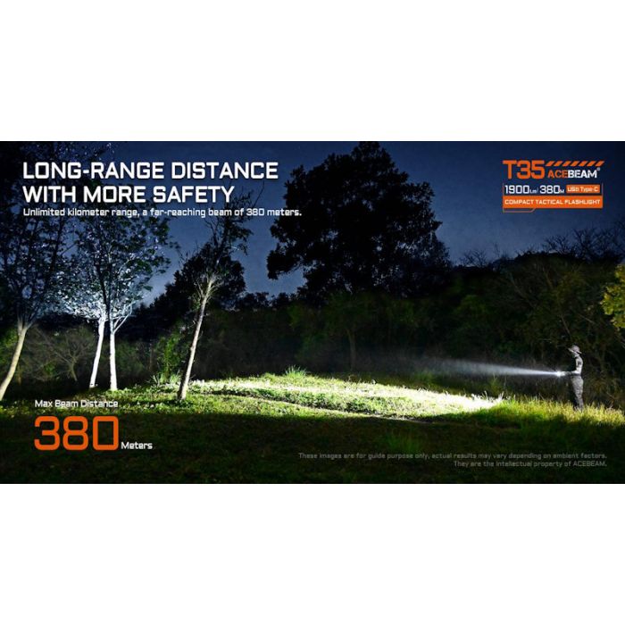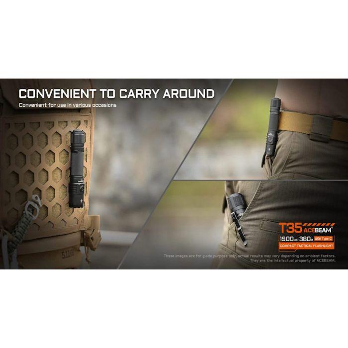 Introducing the Acebeam T35 Compact 1900 Lumens Tactical Flashlight. Engineered for everyday utility and reliability, transforming how you manage tasks in low-light environments. Featuring a high-performance SFT40 LED emitter, this flashlight delivers a maximum output of 1900 lumens with an impressive beam distance of 415 yards (380 meters). Designed not only for illumination but also for personal safety, the T35 incorporates a toothed attack bezel for self-defence, offering peace of mind in dark and potentially hazardous situations.