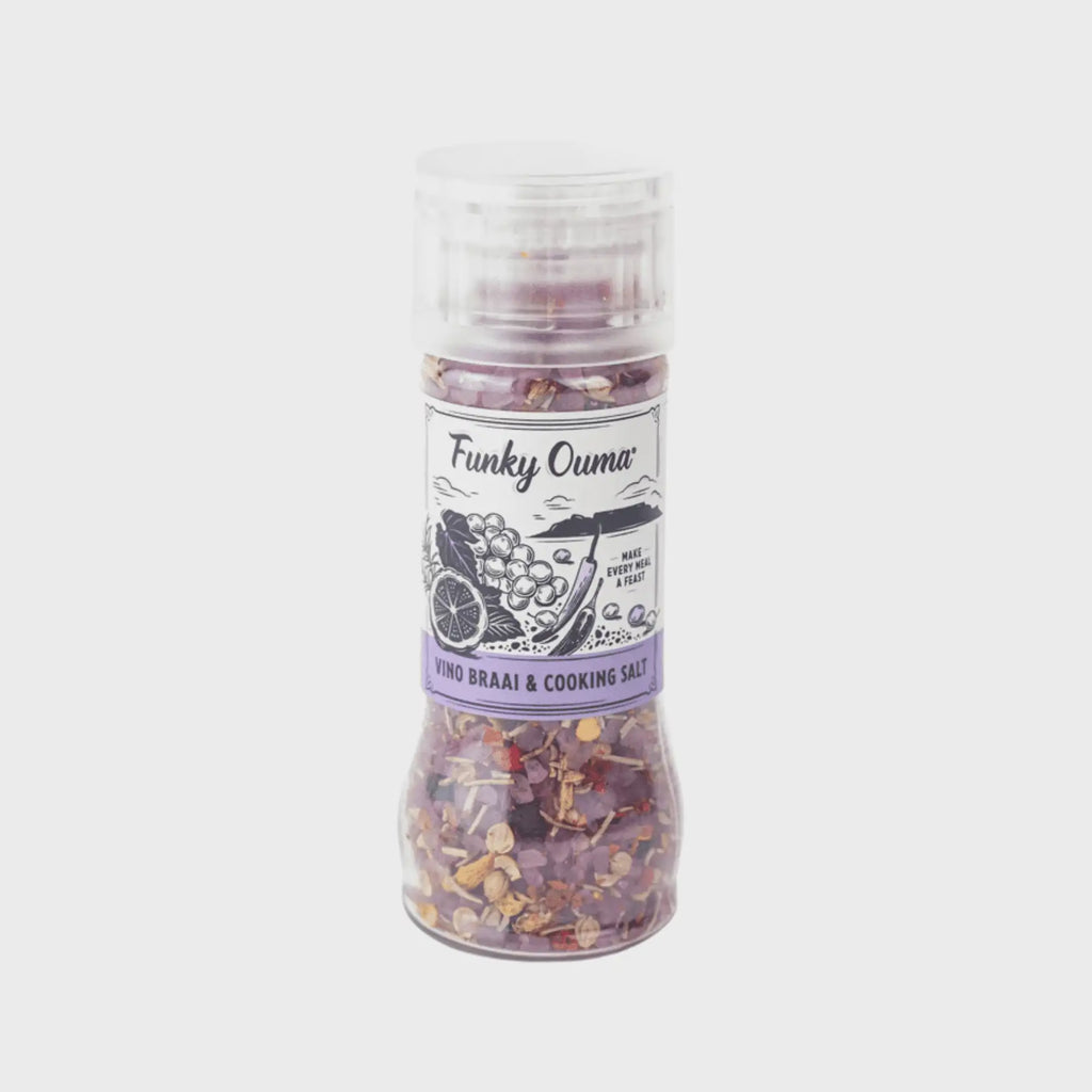 Infused with rich red wine, Funky Ouma’s Vino Braai and Cooking Grinder adds a gourmet twist to every braai and home-cooked meal.
